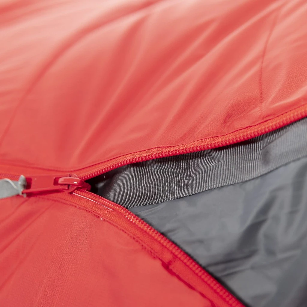 Pour maximiser ses performances thermiques, ce sac de couchage mise sur une coupe étroite et des barrières anti-froid, afin de bien garder votre chaleur corporelle à l’intérieur. Le rabat le long de la fermeture éclair, la collerette et les boudins autour de la capuche sont généreux et assurent cette barrière thermique. Des cordons de serrages et boutons pression permettent de bien les maintenir en place. Pour ventiler, la fermeture éclair trois-quarts est dotée d’un double curseur.