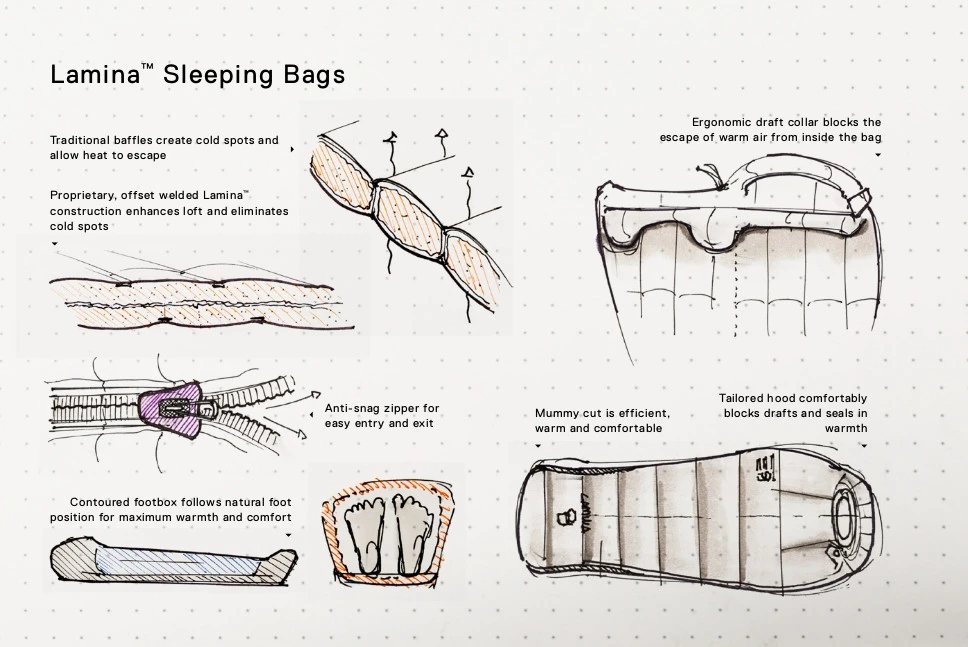 Le sac de couchage Lamina -20F/-29C de Mountain Hardwear dispose d’une construction soudée qui élimine les ponts thermiques. Il est doublé d’une isolation en synthétique Thermal.Q qui lui assure une température de confort d’environ -20°C d’après notre expérience. Mountain Hardwear indique que la température limite confort. La coupe momie, la capuche, la collerette et l’emplacement des pieds ont été ajustés pour épouser au mieux la forme du corps.
